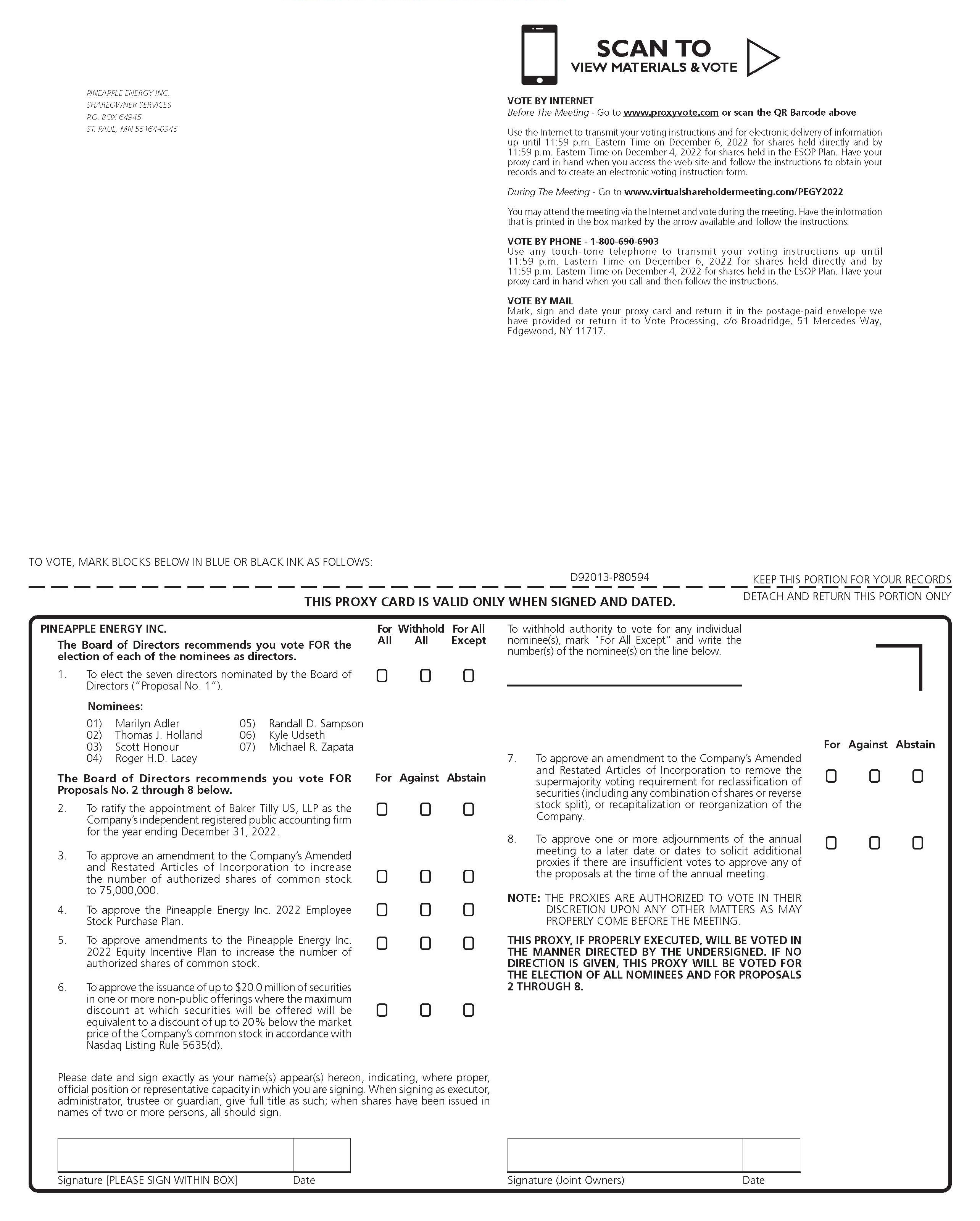 PRELIMINARY COPY, SUBJECT TO COMPLETION SCAN TO VIEW MATERIALS & VOTE PINEAPPLE ENERGY INC. SHAREOWNER SERVICES P.O. BOX 64945 ST. PAUL, MN 55164-0945 w VOTE BY INTERNET Before The Meeting - Go to www.proxyvote.com or scan the QR Barcode above Use the Internet to transmit your voting instructions and for electronic delivery of information up until 11:59 p.m. Eastern Time on December 6, 2022 for shares held directly and by 11:59 p.m. Eastern Time on December 4, 2022 for shares held in the ESOP Plan. Have your proxy card in hand when you access the web site and follow the instructions to obtain your records and to create an electronic voting instruction form. During The Meeting - Go to www.virtualshareholdermeeting.com/PEGY2022 You may attend the meeting via the Internet and vote during the meeting. Have the information that is printed in the box marked by the arrow available and follow the instructions. VOTE BY PHONE - 1-800-690-6903 Use any touch-tone telephone to transmit your voting instructions up until 11:59 p.m. Eastern Time on December 6, 2022 for shares held directly and by 11:59 p.m. Eastern Time on December 4, 2022 for shares held in the ESOP Plan. Have your proxy card in hand when you call and then follow the instructions. VOTE BY MAIL Mark, sign and date your proxy card and return it in the postage-paid envelope we have provided or return it to Vote Processing, c/o Broadridge, 51 Mercedes Way, Edgewood, NY 11717. TO VOTE, MARK BLOCKS BELOW IN BLUE OR BLACK INK AS FOLLOWS: D92013-P80594 THIS PROXY CARD IS VALID ONLY WHEN SIGNED AND DATED. PINEAPPLE ENERGY INC. The Board of Directors recommends you vote FOR the election of each of the nominees as directors. 1. To elect the seven directors nominated by the Board of Directors (“Proposal No. 1”). For Withhold For All All All Except ! ! KEEP THIS PORTION FOR YOUR RECORDS DETACH AND RETURN THIS PORTION ONLY To withhold authority to vote for any individual nominee(s), mark "For All Except" and write the number(s) of the nominee(s) on the line below. ! Nominees: 01) 02) 03) 04) Marilyn Adler Thomas J. Holland Scott Honour Roger H.D. Lacey 05) 06) 07) Randall D. Sampson Kyle Udseth Michael R. Zapata For Against Abstain 7. The Board of Directors recommends you vote FOR Proposals No. 2 through 8 below. For Against Abstain 2. To ratify the appointment of Baker Tilly US, LLP as the Company’s independent registered public accounting firm for the year ending December 31, 2022. ! 3. To approve an amendment to the Company’s Amended and Restated Articles of Incorporation to increase the number of authorized shares of common stock to 75,000,000. ! ! ! 4. To approve the Pineapple Energy Inc. 2022 Employee Stock Purchase Plan. ! ! ! 5. To approve amendments to the Pineapple Energy Inc. 2022 Equity Incentive Plan to increase the number of authorized shares of common stock. ! ! ! 6. To approve the issuance of up to $20.0 million of securities in one or more non-public offerings where the maximum discount at which securities will be offered will be equivalent to a discount of up to 20% below the market price of the Company’s common stock in accordance with Nasdaq Listing Rule 5635(d). ! ! ! ! ! 8. To approve an amendment to the Company’s Amended and Restated Articles of Incorporation to remove the supermajority voting requirement for reclassification of securities (including any combination of shares or reverse stock split), or recapitalization or reorganization of the Company. To approve one or more adjournments of the annual meeting to a later date or dates to solicit additional proxies if there are insufficient votes to approve any of the proposals at the time of the annual meeting. NOTE: THE PROXIES ARE AUTHORIZED TO VOTE IN THEIR DISCRETION UPON ANY OTHER MATTERS AS MAY PROPERLY COME BEFORE THE MEETING. THIS PROXY, IF PROPERLY EXECUTED, WILL BE VOTED IN THE MANNER DIRECTED BY THE UNDERSIGNED. IF NO DIRECTION IS GIVEN, THIS PROXY WILL BE VOTED FOR THE ELECTION OF ALL NOMINEES AND FOR PROPOSALS 2 THROUGH 8. Please date and sign exactly as your name(s) appear(s) hereon, indicating, where proper, official position or representative capacity in which you are signing. When signing as executor, administrator, trustee or guardian, give full title as such; when shares have been issued in names of two or more persons, all should sign. Signature [PLEASE SIGN WITHIN BOX] Date Signature (Joint Owners) Date ! ! ! ! ! !